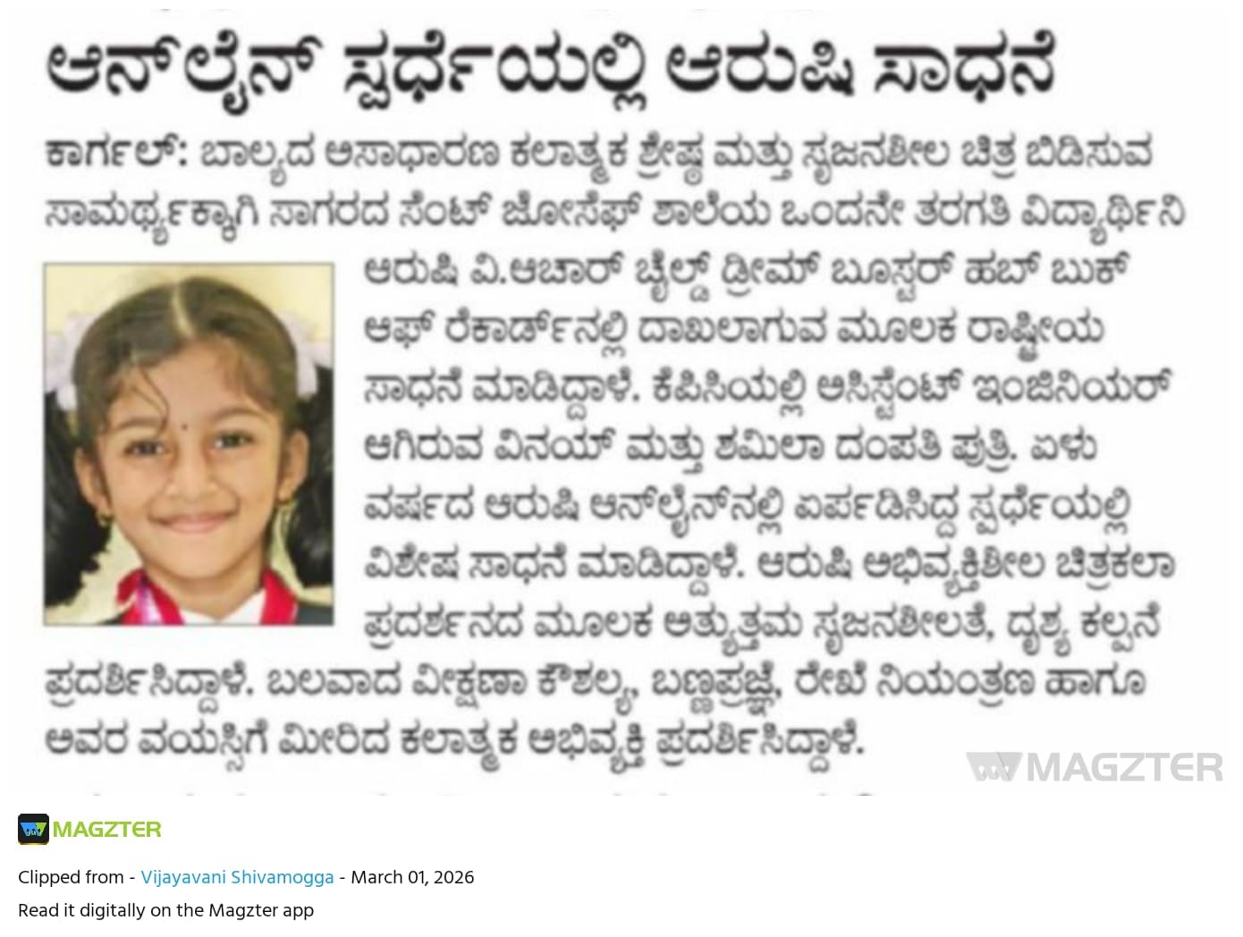 Your extraordinary achievement has also gained recognition in the media and was proudly published in the popular Kannada newspaper Vijayavani, one of Karnataka’s leading news publications.