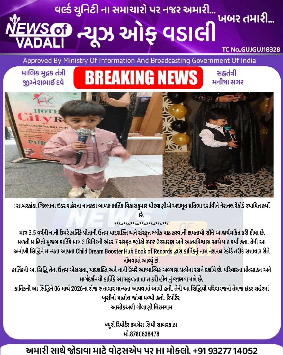 📰🏆 Congratulations to Kartik Vikaskumar Motvani (Idar, Gujarat), who became an Official National Record Holder 2026 by Child Dream Booster Hub – Book of Records for chanting 7 Sanskrit Shlokas in 3 minutes at just 3.5 years of age. 🌟