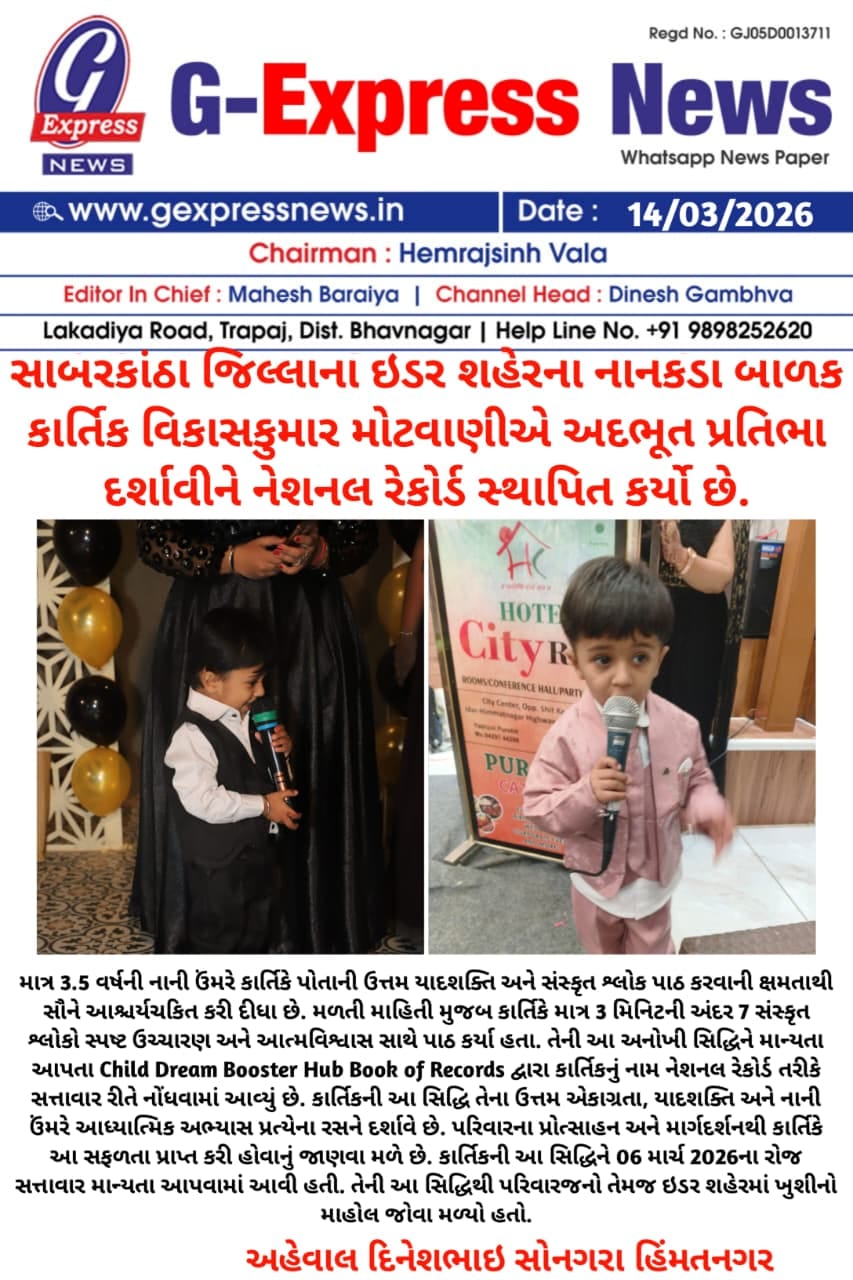 Harshvi Brijesh Vaghela, our Child Dream Booster Hub Book of Records – National Record Holder, has been featured in Sandesh Newspaper, Ahmedabad! 🗞️✨